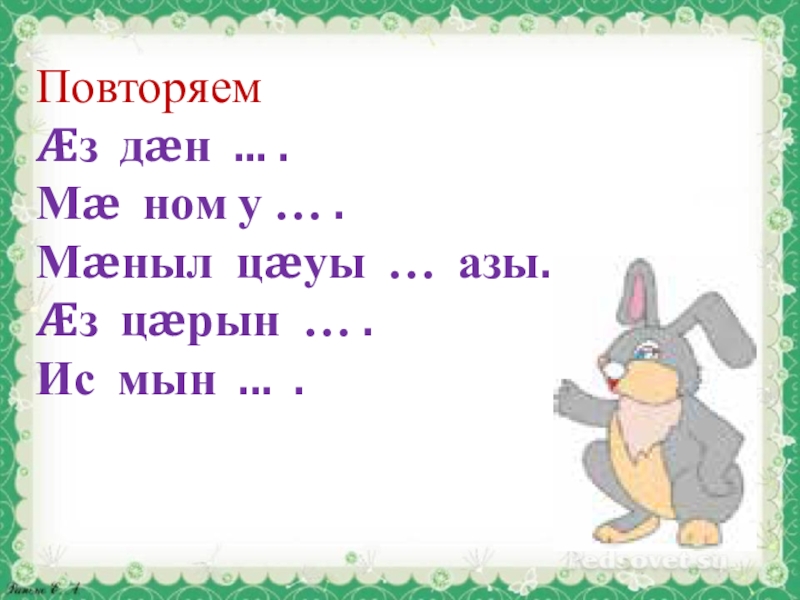 Повторяем Æз дæн ... . Мæ ном у … . Мæныл цæуы … азы.. Æз цæрын …