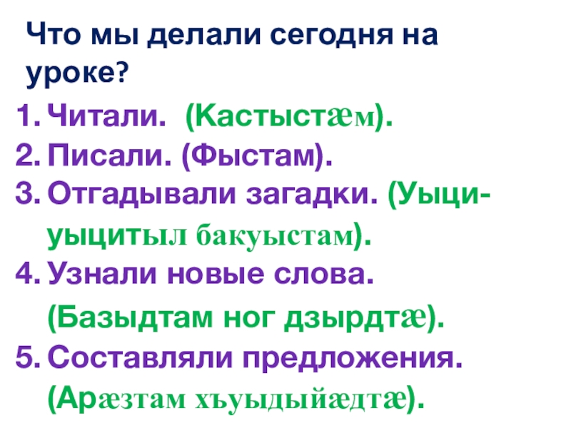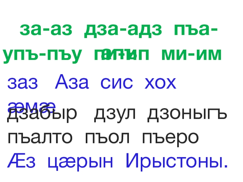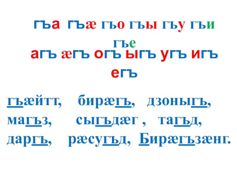 гъӕйтт, бирӕгъ, дзоныгъ, магъз, сыгъдӕг , тагъд, даргъ, рӕсугъд, Бирӕгъзӕнг.