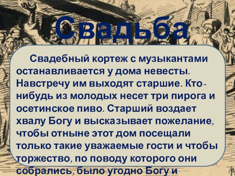 Навстречу им выходят старшие. Кто-нибудь из молодых несет три пирога и осетинское пиво. Старший воздает хвалу Богу и высказывает пожелание, чтобы отныне этот дом посещали только такие уважаемые гости и чтобы торжество, по поводу которого они собрались, было угодно Богу и ангелам.