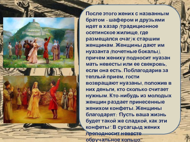 в хазар (традиционное осетинское жилище, где размещался очаг) к старшим женщинам. Женщины дают им нуазанта (почетные бокалы), причем жениху подносит нуазан мать невесты или ее свекровь, если она есть. Поблагодарив за теплый прием, гости возвращают нуазаны, положив в них деньги, кто сколько считает нужным. Кто-нибудь из молодых женщин раздает принесенные женихом конфеты. Женщины благодарят: "Пусть ваша жизнь будет такой же сладкой, как эти конфеты". В сусагцыд жених преподносит невесте обручальное кольцо.