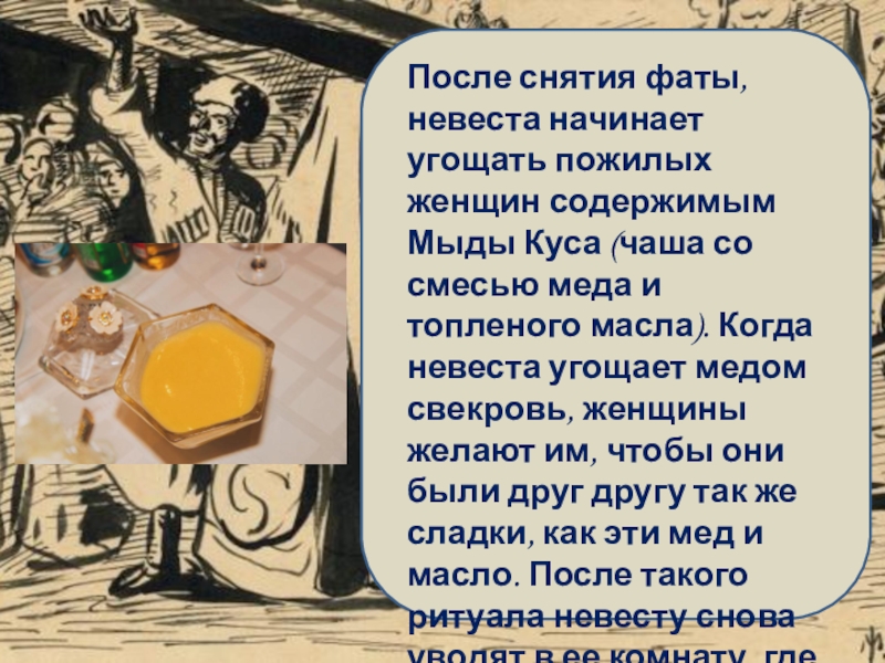 (чаша со смесью меда и топленого масла). Когда невеста угощает медом свекровь, женщины желают им, чтобы они были друг другу так же сладки, как эти мед и масло. После такого ритуала невесту снова уводят в ее комнату, где возобновляются развлечения, танцы и песни.