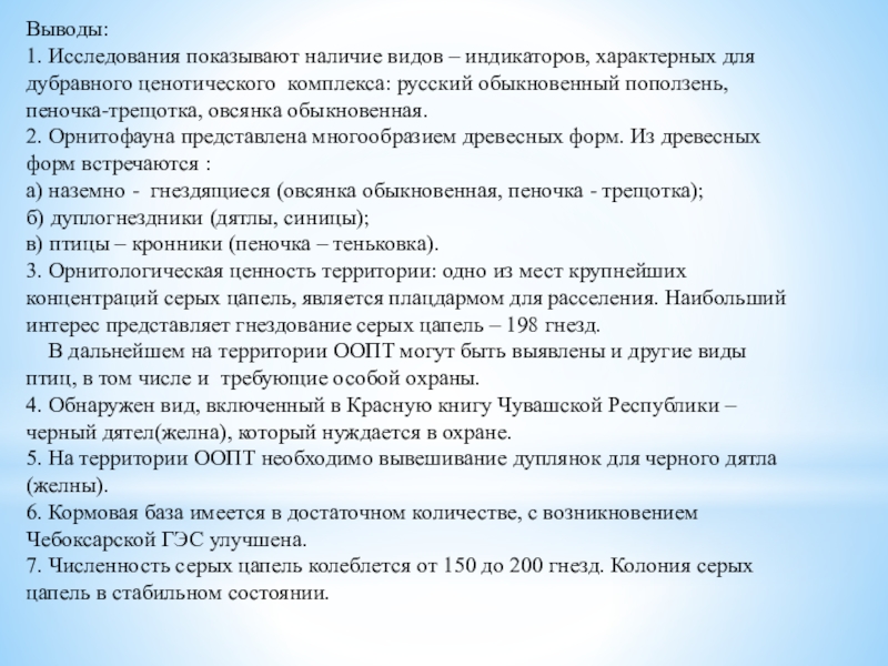 В настоящее время имеющиеся сведения об орнитофауне и перспективных для охраны природных территорий недостаточны. Необходимы исследования и поиск мест обитания редких и исчезающих видов в целях их эффективной охраны.