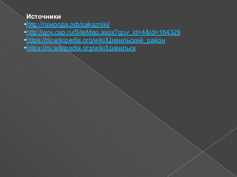 Источникиhttp://природа.рф/zakazniki/http://gov.cap.ru/SiteMap.aspx?gov_id=4&id=164329https://ru.wikipedia.org/wiki/Цивильский_районhttps://ru.wikipedia.org/wiki/Цивильск