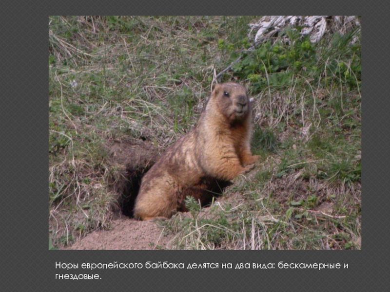 Слайд 7Норы европейского байбака делятся на два вида: бескамерные и гнездовые.