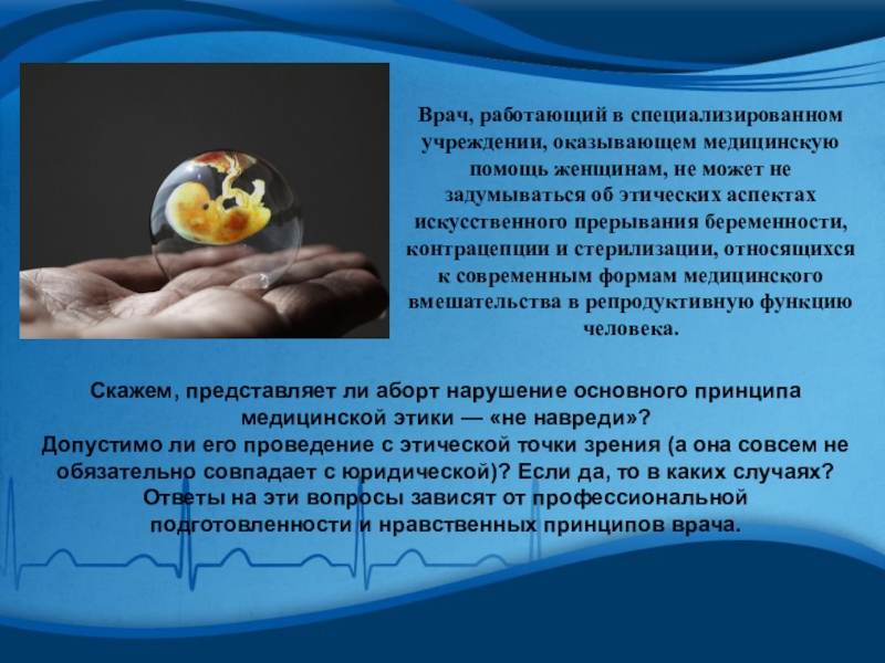 не задумываться об этических аспектах искусственного прерывания беременности, контрацепции и стерилизации, относящихся к современным формам медицинского вмешательства в репродуктивную функцию человека.