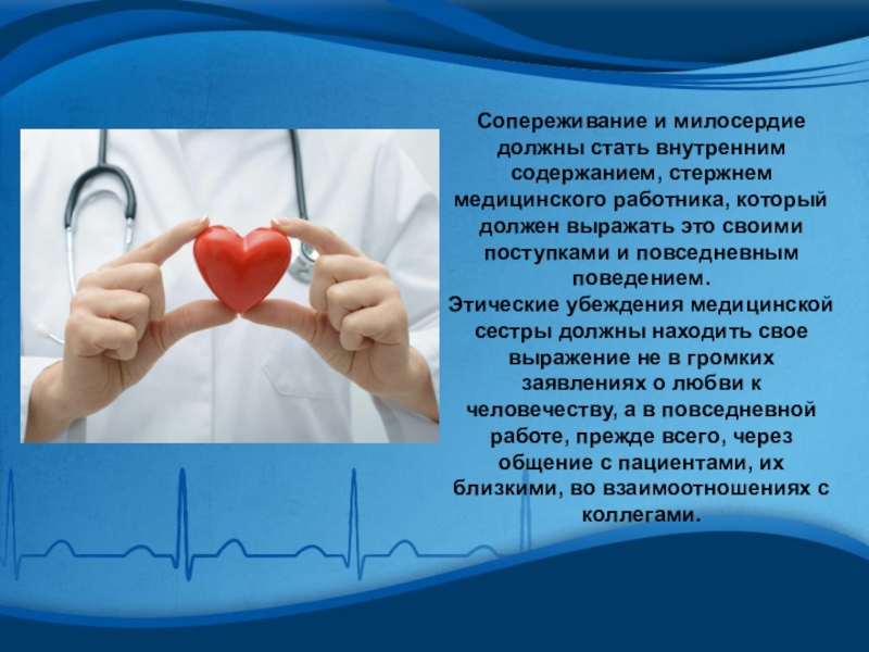 Слайд 23Сопереживание и милосердие должны стать внутренним содержанием, стержнем медицинского работника, который