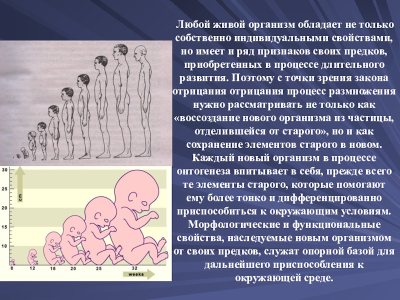 свойствами, но имеет и ряд признаков своих предков, приобретенных в процессе длительного развития. Поэтому с точки зрения закона отрицания отрицания процесс размножения нужно рассматривать не только как «воссоздание нового организма из частицы, отделившейся от старого», но и как сохранение элементов старого в новом. Каждый новый организм в процессе онтогенеза впитывает в себя, прежде всего те элементы старого, которые помогают ему более тонко и дифференцированно приспособиться к окружающим условиям. Морфологические и функциональные свойства, наследуемые новым организмом от своих предков, служат опорной базой для дальнейшего приспособления к окружающей среде.