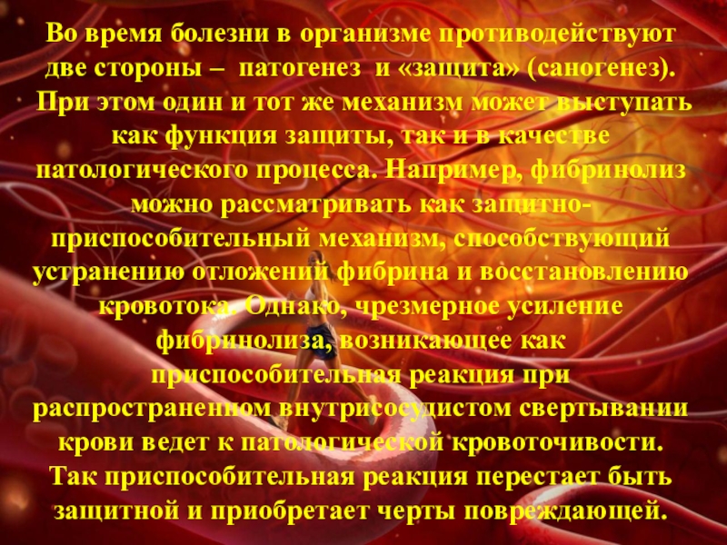 «защита» (саногенез). При этом один и тот же механизм может выступать как функция защиты, так и в качестве патологического процесса. Например, фибринолиз можно рассматривать как защитно-приспособительный механизм, способствующий устранению отложений фибрина и восстановлению кровотока. Однако, чрезмерное усиление фибринолиза, возникающее как приспособительная реакция при распространенном внутрисосудистом свертывании крови ведет к патологической кровоточивости. Так приспособительная реакция перестает быть защитной и приобретает черты повреждающей.