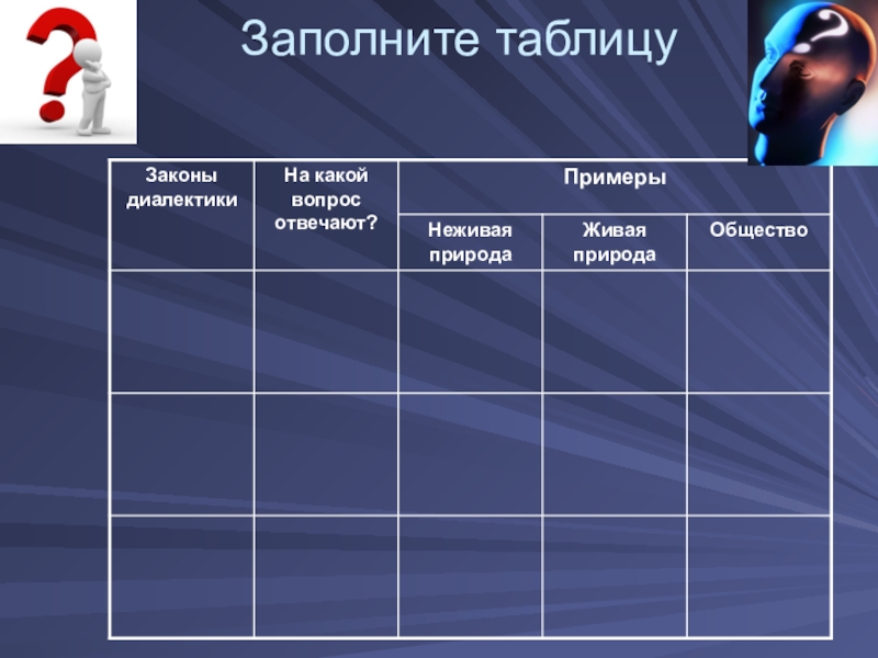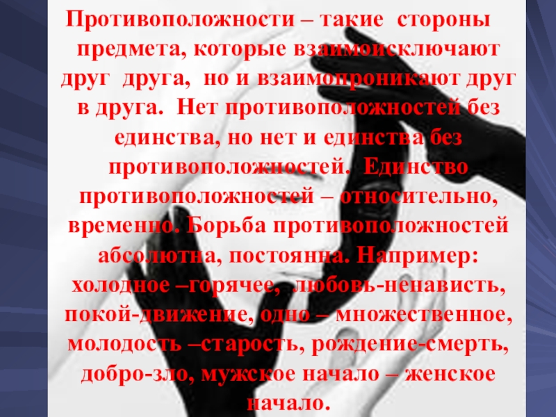 взаимопроникают друг в друга. Нет противоположностей без единства, но нет и единства без противоположностей. Единство противоположностей – относительно, временно. Борьба противоположностей абсолютна, постоянна. Например: холодное –горячее, любовь-ненависть, покой-движение, одно – множественное, молодость –старость, рождение-смерть, добро-зло, мужское начало – женское начало.