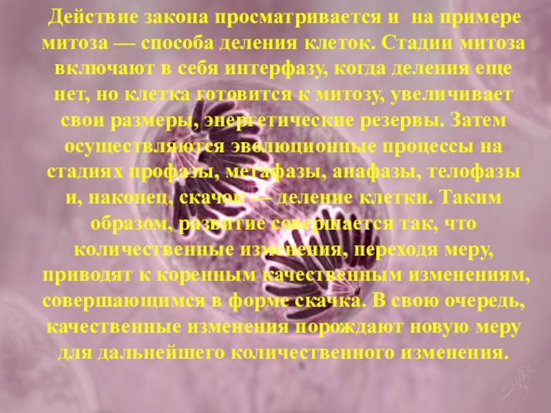 способа деления клеток. Стадии митоза включают в себя интерфазу, когда деления еще нет, но клетка готовится к митозу, увеличивает свои размеры, энергетические резервы. Затем осуществляются эволюционные процессы на стадиях профазы, метафазы, анафазы, телофазы и, наконец, скачок — деление клетки. Таким образом, развитие совершается так, что количественные изменения, переходя меру, приводят к коренным качественным изменениям, совершающимся в форме скачка. В свою очередь, качественные изменения порождают новую меру для дальнейшего количественного изменения.