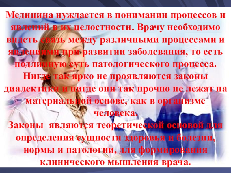 Слайд 3Медицина нуждается в понимании процессов и явлений в их целостности. Врачу