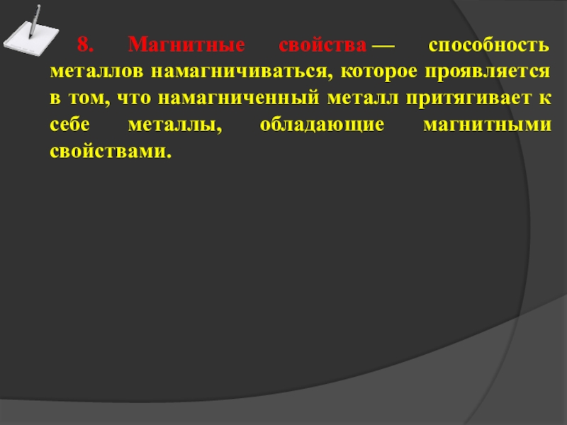 7. Электропроводность — способность металлов и сплавов проводить электрический ток.