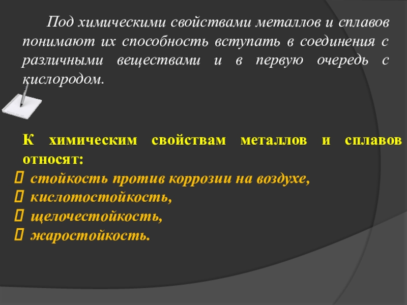 Под химическими свойствами металлов и сплавов понимают их способность вступать в соединения с различными веществами и в первую очередь с кислородом.
