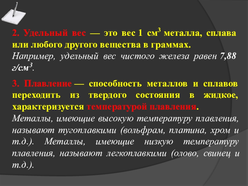 3. Плавление — способность металлов и сплавов переходить из твердого состояния в жидкое, характеризуется температурой плавления.