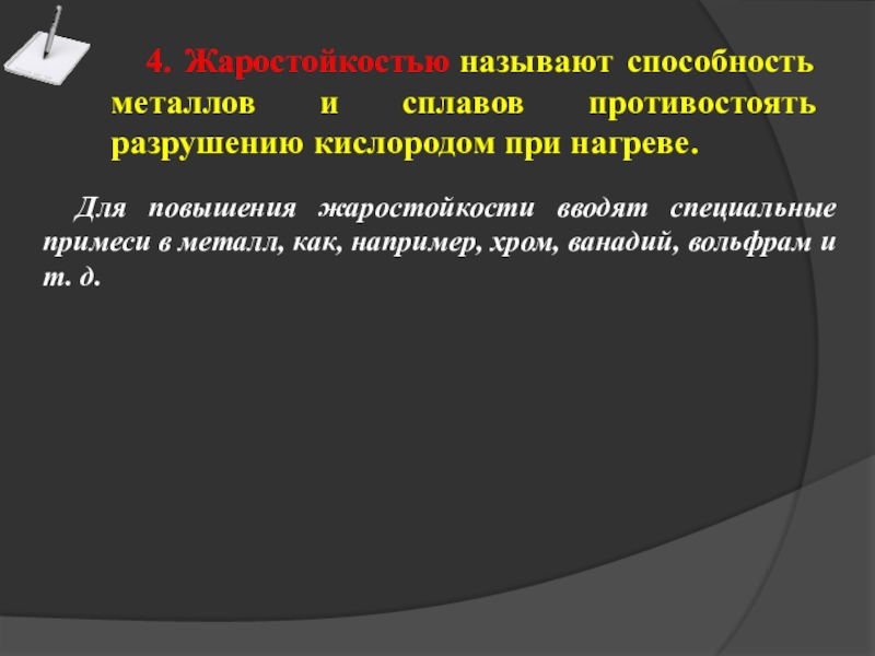 Для повышения жаростойкости вводят специальные примеси в металл, как, например, хром, ванадий, вольфрам и т. д.