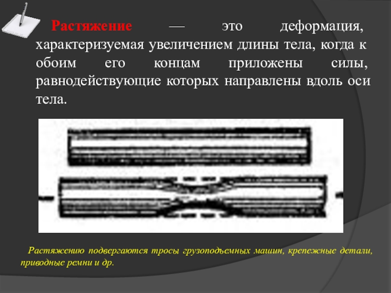 Растяжению подвергаются тросы грузоподъемных машин, крепежные детали, приводные ремни и др.