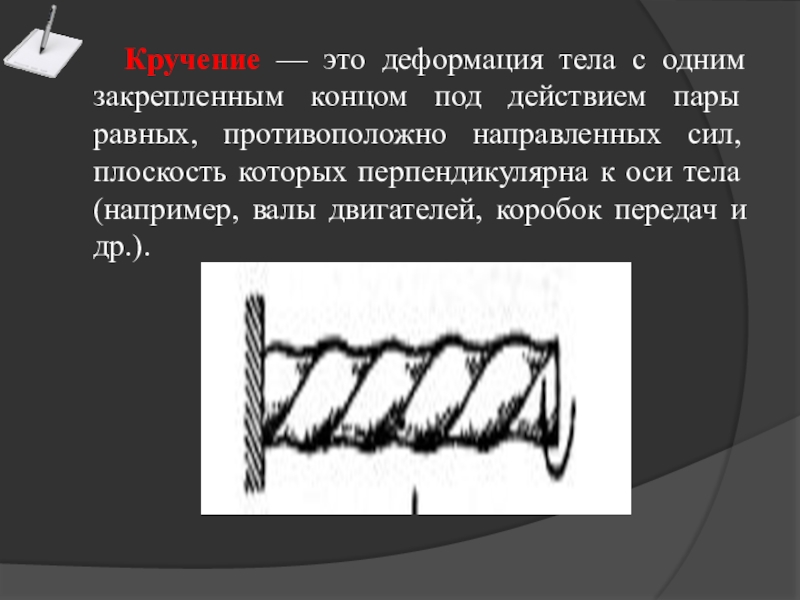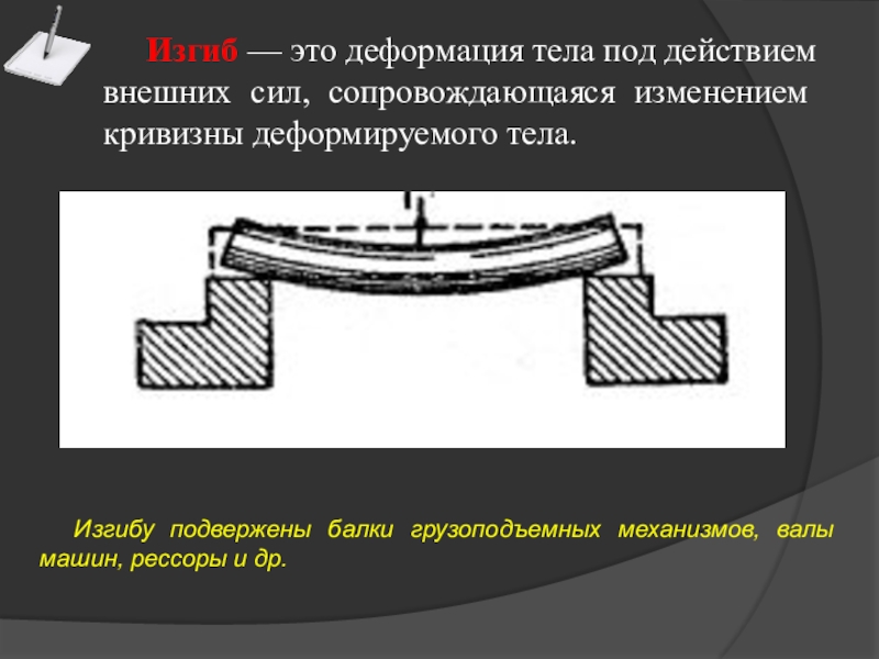 Изгибу подвержены балки грузоподъемных механизмов, валы машин, рессоры и др.