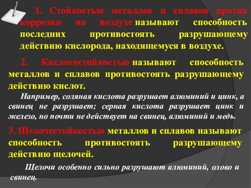 2. Кислотостойкостью называют способность металлов и сплавов противостоять разрушающему действию кислот.