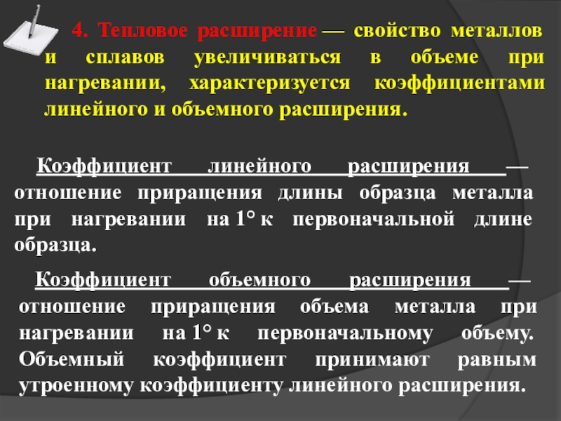 Коэффициент объемного расширения — отношение приращения объема металла при нагревании на 1° к первоначальному объему. Объемный коэффициент принимают равным утроенному коэффициенту линейного расширения.
