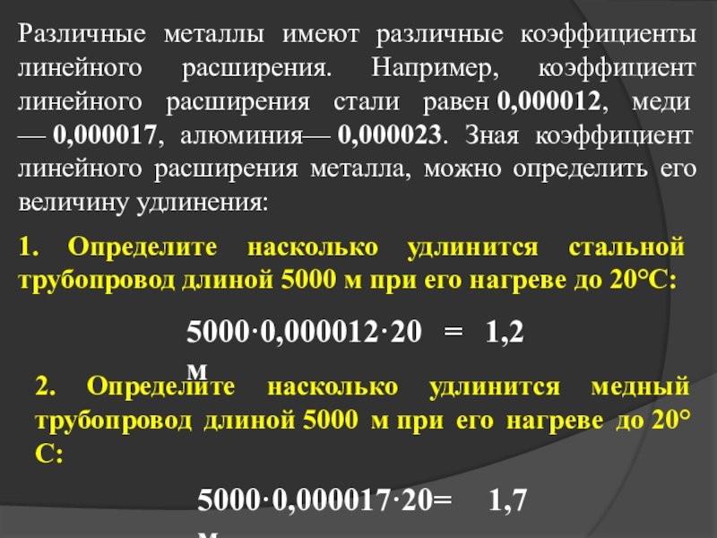 2. Определите насколько удлинится медный трубопровод длиной 5000 м при его нагреве до 20°С: