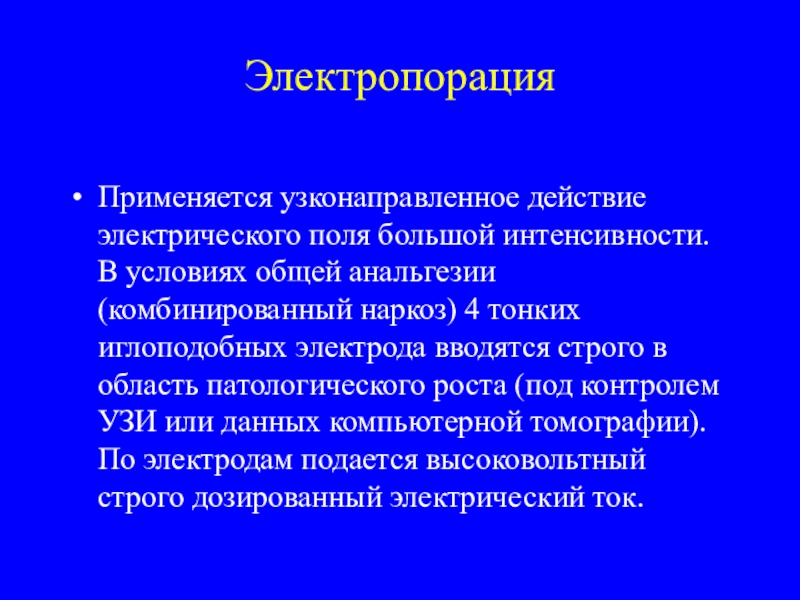 Применяется узконаправленное действие электрического поля большой интенсивности. В условиях общей анальгезии