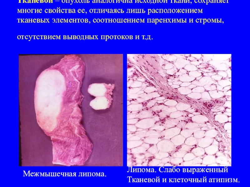 Слайд 19Тканевой – опухоль аналогична исходной ткани, сохраняет многие свойства ее, отличаясь
