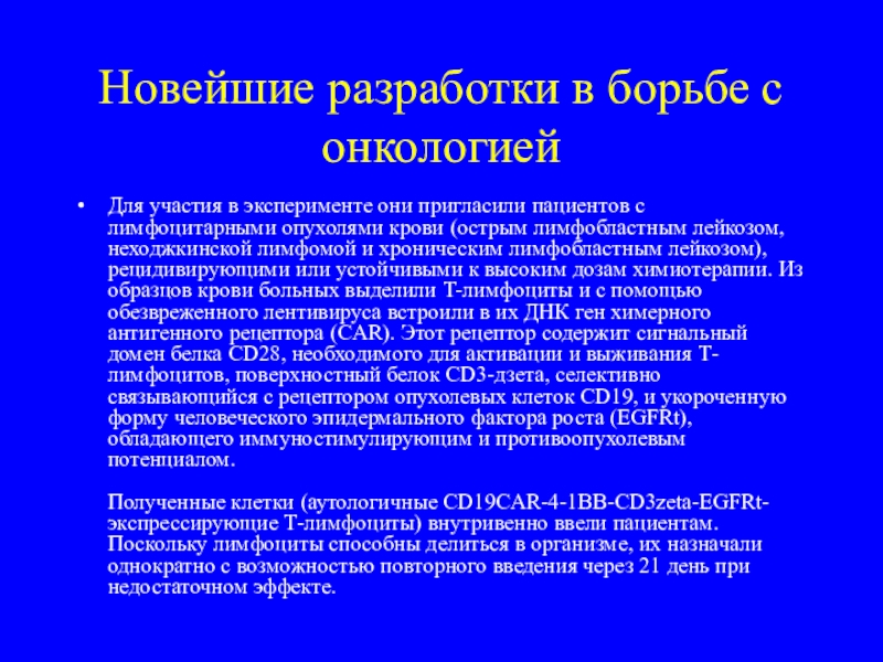 пациентов с лимфоцитарными опухолями крови (острым лимфобластным лейкозом, неходжкинской лимфомой и хроническим лимфобластным лейкозом), рецидивирующими или устойчивыми к высоким дозам химиотерапии. Из образцов крови больных выделили Т-лимфоциты и с помощью обезвреженного лентивируса встроили в их ДНК ген химерного антигенного рецептора (CAR). Этот рецептор содержит сигнальный домен белка CD28, необходимого для активации и выживания Т-лимфоцитов, поверхностный белок CD3-дзета, селективно связывающийся с рецептором опухолевых клеток CD19, и укороченную форму человеческого эпидермального фактора роста (EGFRt), обладающего иммуностимулирующим и противоопухолевым потенциалом.