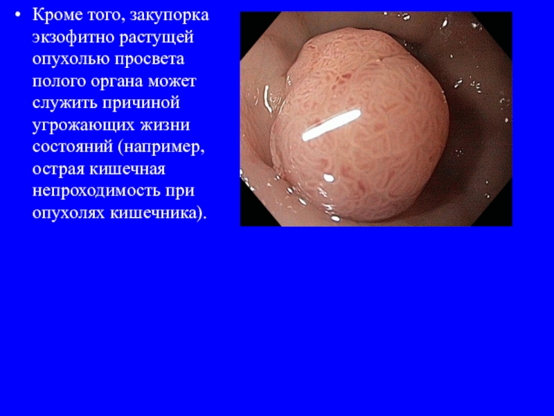 По отношению к просвету полого органа различают экзофитный рост, при котором опухоль растет в просвет полого органа, и эндофитный, при котором опухоль растет в глубь стенки органа.