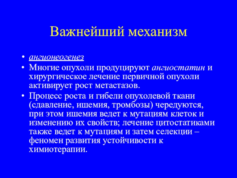 Процесс роста и гибели опухолевой ткани (сдавление, ишемия, тромбозы) чередуются, при этом ишемия ведет к мутациям клеток и изменению их свойств; лечение цитостатиками также ведет к мутациям и затем селекции – феномен развития устойчивости к химиотерапии.