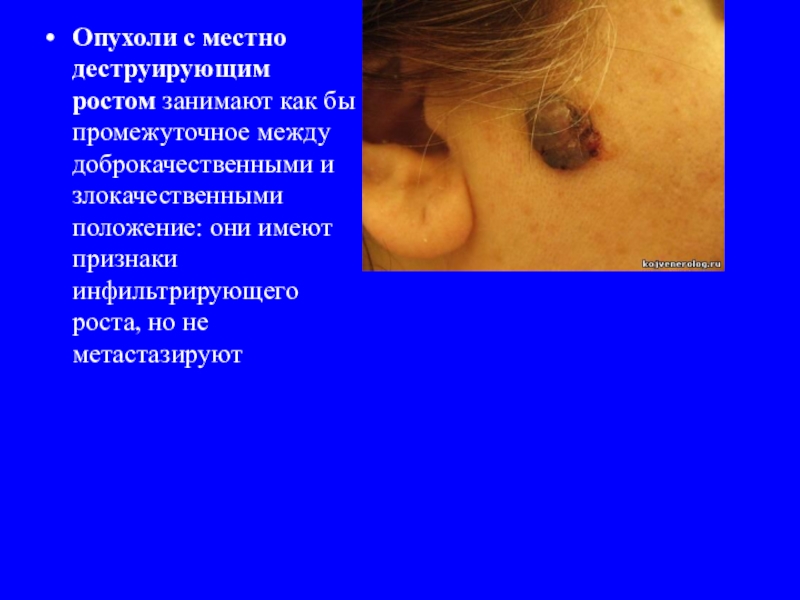 2. инфильтрирующий (инвазивный) рост, который характеризуется тем, что клетки опухоли врастают за ее пределы в окружающие ткани, разрушая их (деструирующий рост);