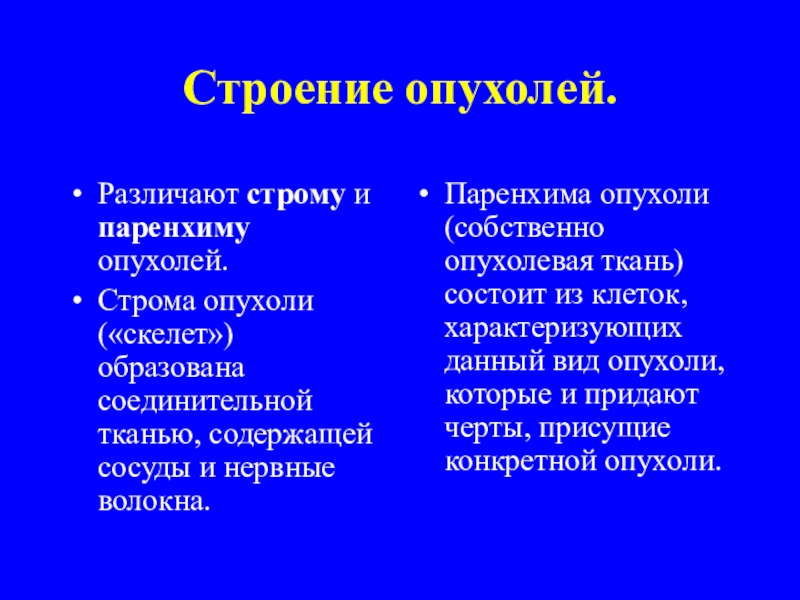 Паренхима опухоли (собственно опухолевая ткань) состоит из клеток, характеризующих данный вид опухоли, которые и придают черты, присущие конкретной опухоли.