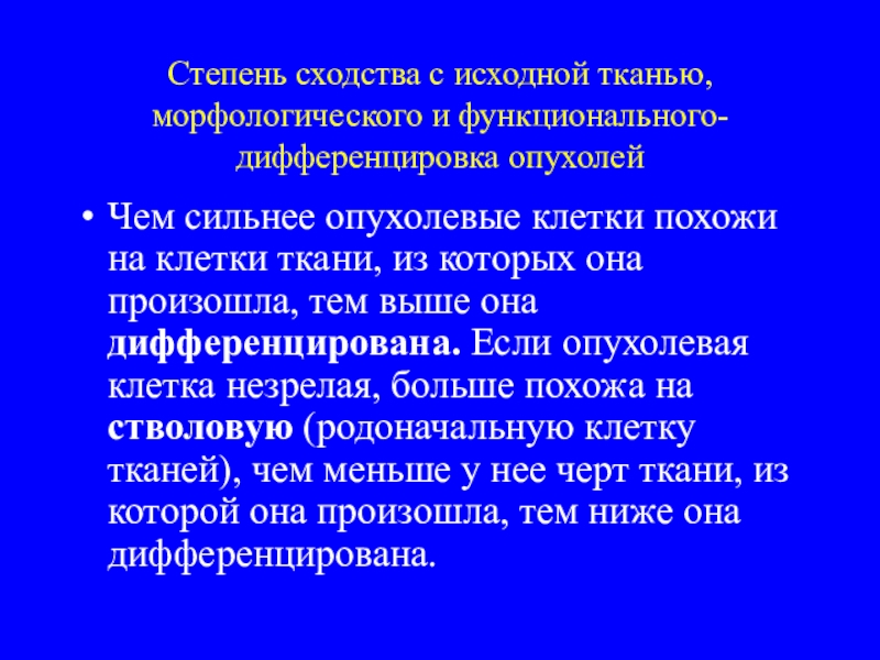 опухолевые клетки похожи на клетки ткани, из которых она произошла, тем выше она дифференцирована. Если опухолевая клетка незрелая, больше похожа на стволовую (родоначальную клетку тканей), чем меньше у нее черт ткани, из которой она произошла, тем ниже она дифференцирована.