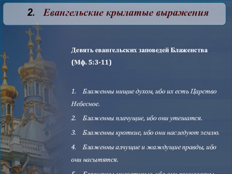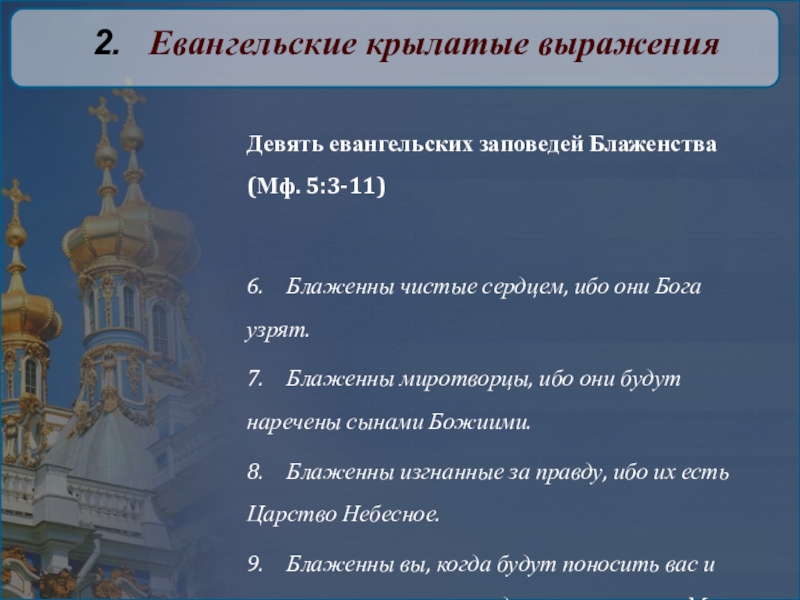 Слайд 16Девять евангельских заповедей Блаженства (Мф. 5:3-11)