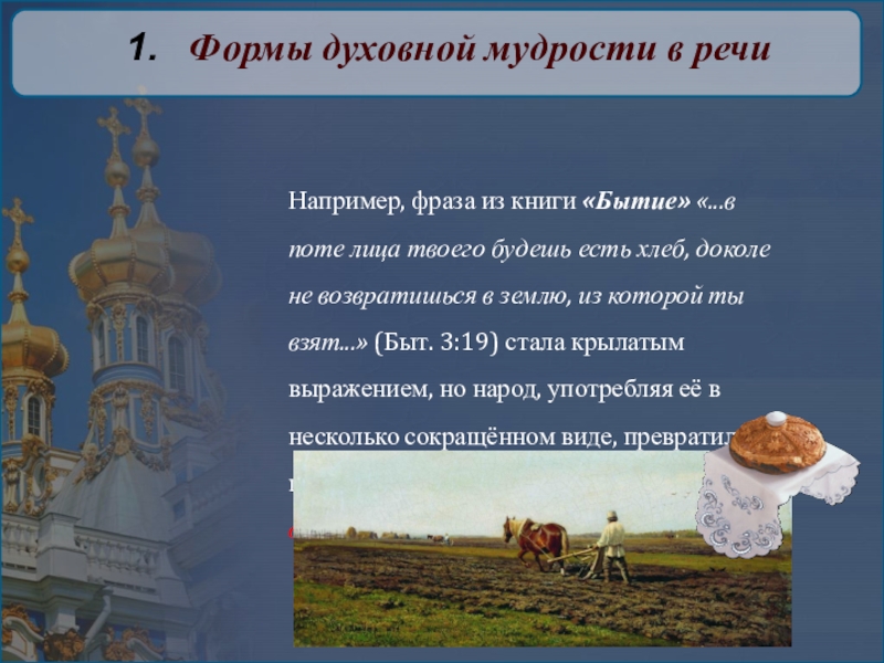 хлеб, доколе не возвратишься в землю, из которой ты взят...» (Быт. 3:19) стала крылатым выражением, но народ, употребляя её в несколько сокращённом виде, превратил в пословицу: «В поте лица своего нужно добывать хлеб свой насущный».