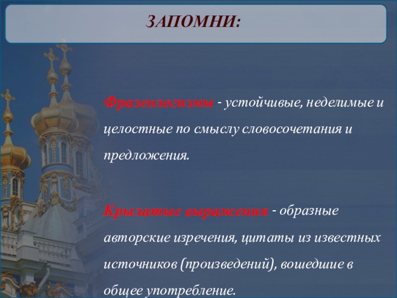Фразеологизмы - устойчивые, неделимые и целостные по смыслу словосочетания и предложения.