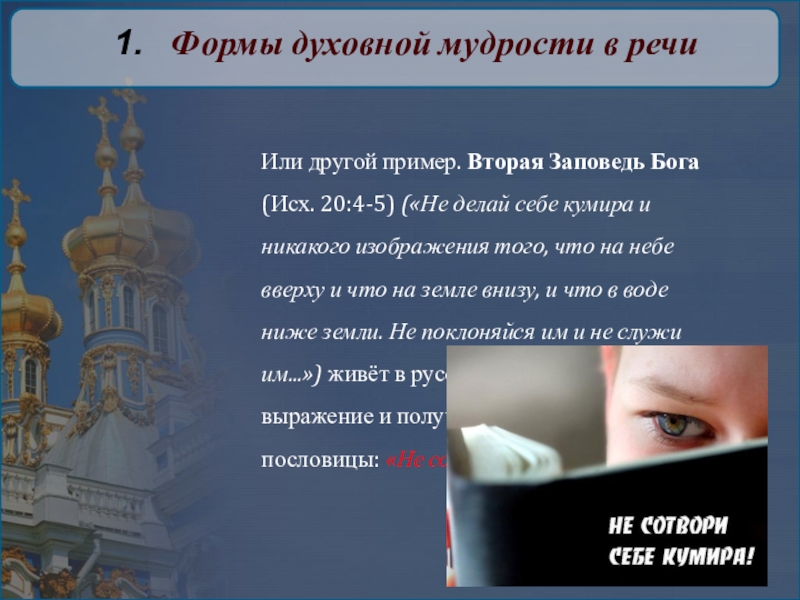 кумира и никакого изображения того, что на небе вверху и что на земле внизу, и что в воде ниже земли. Не поклоняйся им и не служи им...») живёт в русском языке как крылатое выражение и получила краткую форму пословицы: «Не сотвори себе кумира».