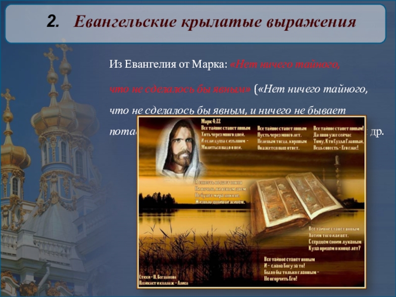(«Нет ничего тайного, что не сделалось бы явным, и ничего не бывает потаённого, что не вышло бы наружу». Мк. 4:22) и др.