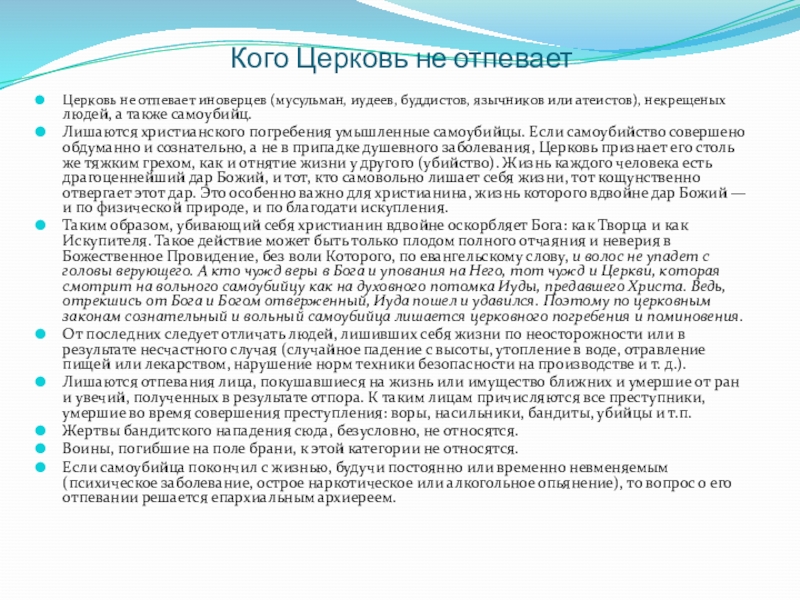Лишаются христианского погребения умышленные самоубийцы. Если самоубийство совершено обдуманно и сознательно, а не в припадке душевного заболевания, Церковь признает его столь же тяжким грехом, как и отнятие жизни у другого (убийство). Жизнь каждого человека есть драгоценнейший дар Божий, и тот, кто самовольно лишает себя жизни, тот кощунственно отвергает этот дар. Это особенно важно для христианина, жизнь которого вдвойне дар Божий — и по физической природе, и по благодати искупления.