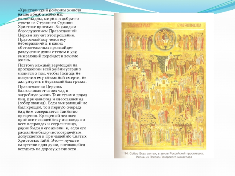 Слайд 2«Христианский кончины живота нашего безболезненны, непостыдны, мирны и добра-го ответа на