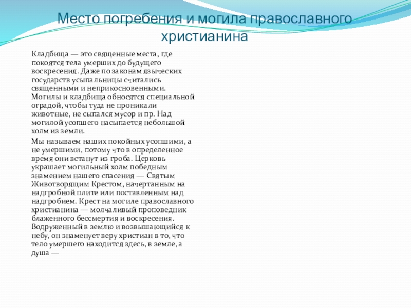 Мы называем наших покойных усопшими, а не умершими, потому что в определенное время они встанут из гроба. Церковь украшает могильный холм победным знамением нашего спасения — Святым Животворящим Крестом, начертанным на надгробной плите или поставленным над надгробием. Крест на могиле православного христианина — молчаливый проповедник блаженного бессмертия и воскресения. Водруженный в землю и возвышающийся к небу, он знаменует веру христиан в то, что тело умершего находится здесь, в земле, а душа —
