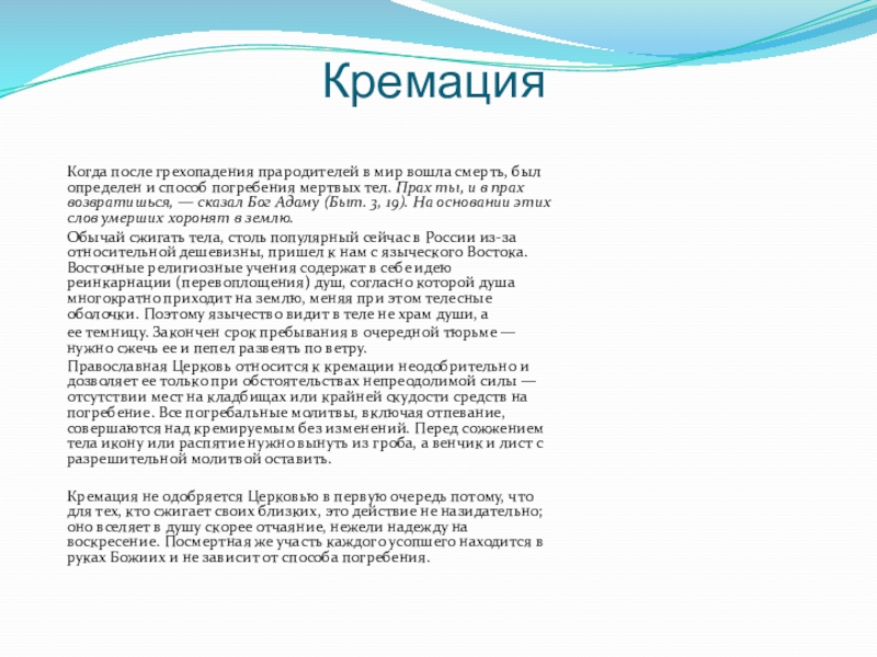 Кремация не одобряется Церковью в первую очередь потому, что для тех, кто сжигает своих близких, это действие не назидательно; оно вселяет в душу скорее отчаяние, нежели надежду на воскресение. Посмертная же участь каждого усопшего находится в руках Божиих и не зависит от способа погребения.