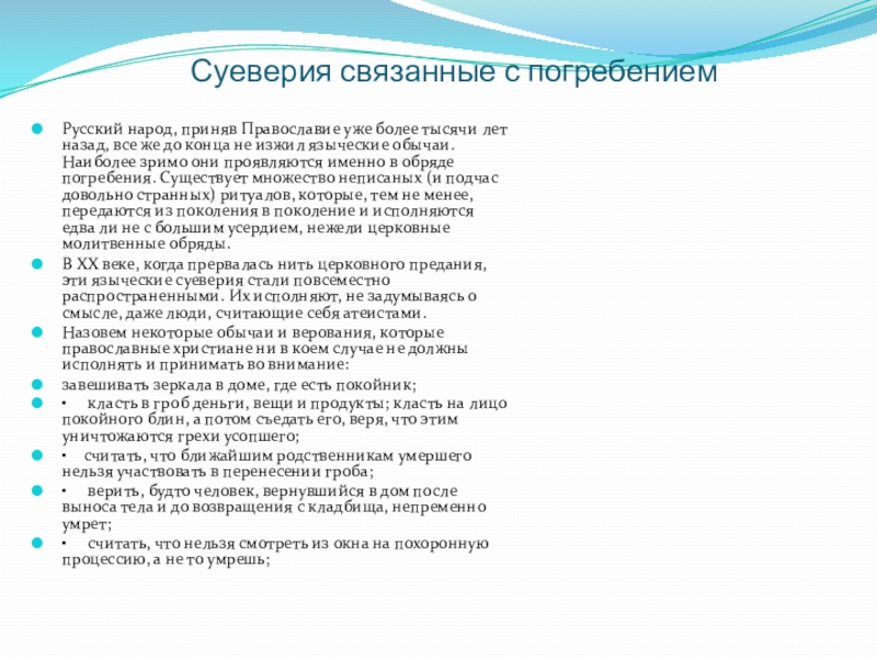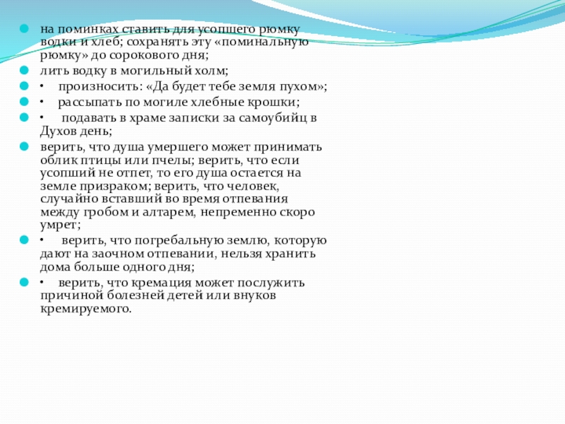 верить, что душа умершего может принимать облик птицы или пчелы; верить, что если усопший не отпет, то его душа остается на земле призраком; верить, что человек, случайно вставший во время отпевания между гробом и алтарем, непременно скоро умрет;