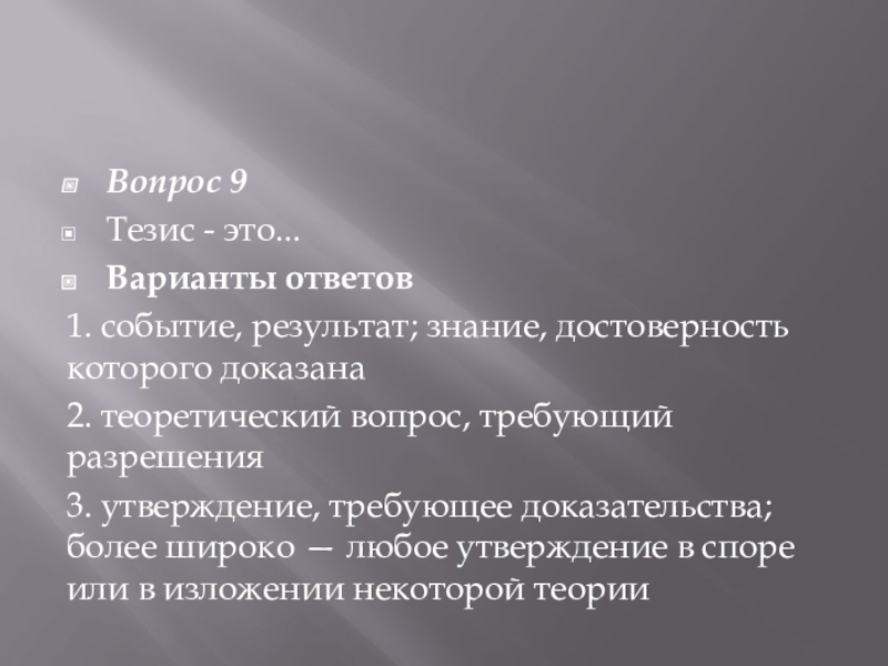 Вопрос 9Тезис - это...Варианты ответов1. событие, результат; знание, достоверность которого доказана2. теоретический вопрос, требующий разрешения3. утверждение, требующее доказательства;