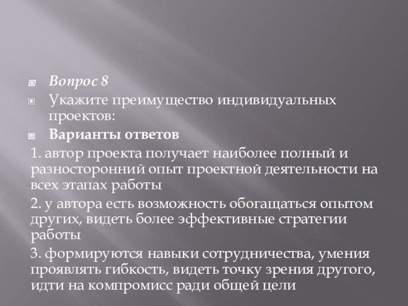 Вопрос 8Укажите преимущество индивидуальных проектов:Варианты ответов1. автор проекта получает наиболее полный и разносторонний опыт проектной деятельности на