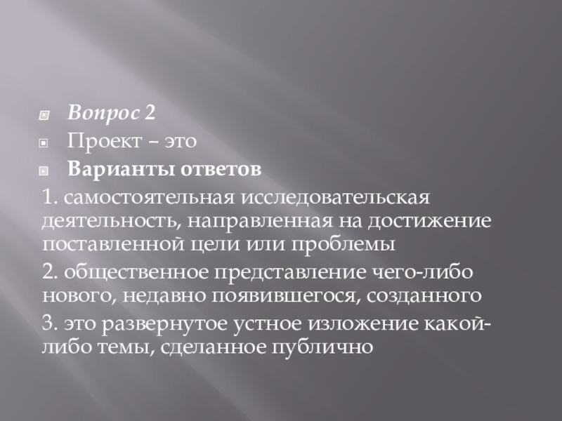 Вопрос 2Проект – этоВарианты ответов1. самостоятельная исследовательская деятельность, направленная на достижение поставленной цели или проблемы2. общественное представление