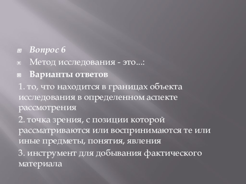 Вопрос 6Метод исследования - это...:Варианты ответов1. то, что находится в границах объекта исследования в определенном аспекте рассмотрения2.