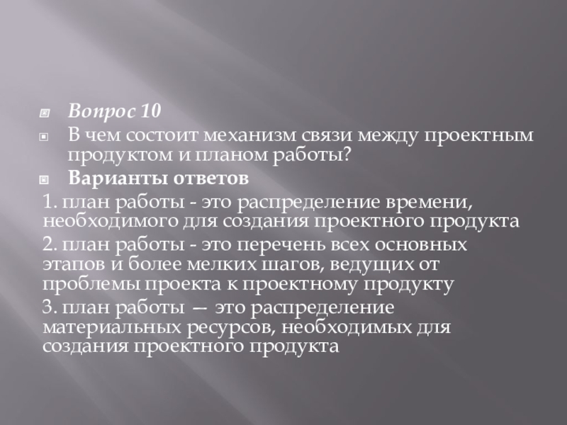 Вопрос 10В чем состоит механизм связи между про­ектным продуктом и планом работы?Варианты ответов1. план работы - это