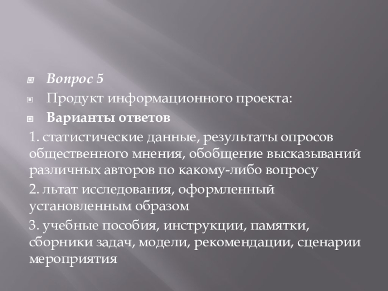 Вопрос 5Продукт информационного проекта:Варианты ответов1. статистические данные, результаты опросов общественного мнения, обобщение высказываний различных авторов по какому-либо