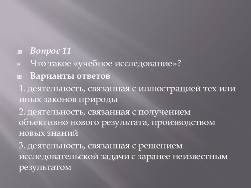 Вопрос 11Что такое «учебное исследование»?Варианты ответов1. деятельность, связанная с иллюстрацией тех или иных законов природы2. деятельность, связанная