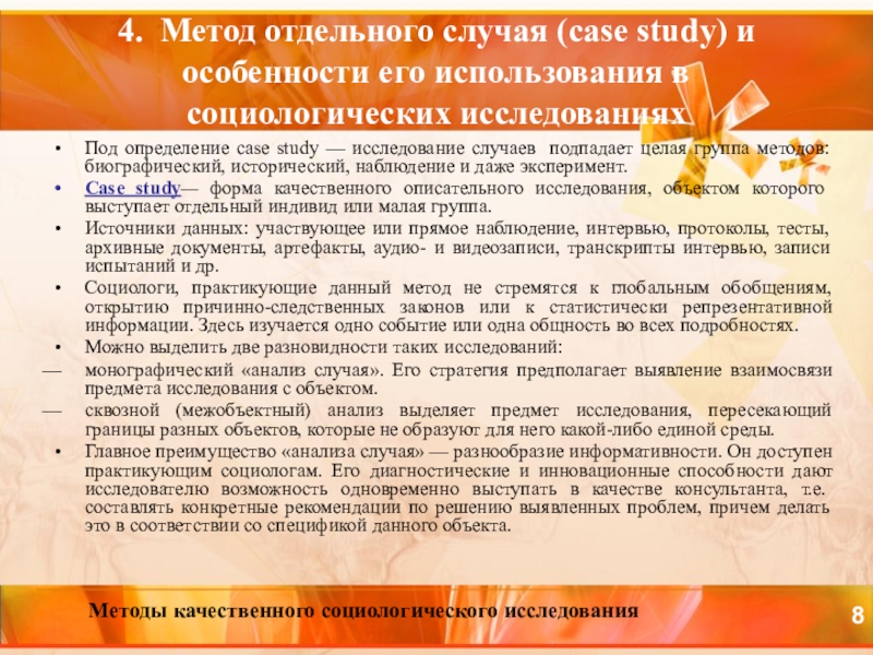 Case study— форма качественного описательного исследования, объектом которого выступает отдельный индивид или малая группа.